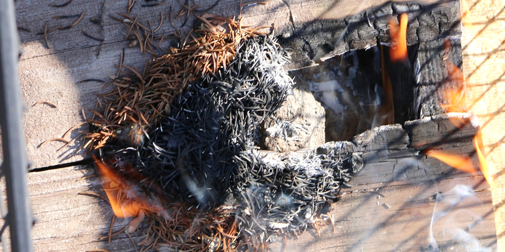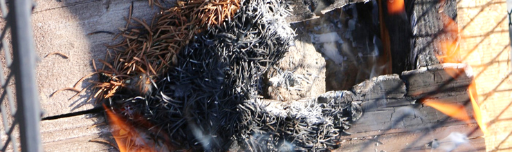 The roof debris, including leaves and pine needles, and the cedar shake shingle roofing materials were provided to ESi for analysis and testing. The post-report ignition of the BC401 paper wrapping was a critical data point related to the laboratory testing for the roof debris. The testing determined the burning paper wrapping was a sufficient heat source to ignite the pine needles and rooftop debris into a smoldering fire. Next, the transition between a smoldering fire of debris to the rooftop material had to be verified. The rooftop debris was tested and confirmed as a sufficient heat source to ignite roofing material. The debris was positioned on top of multiple cedar shake shingles and ignited to a smoldering fire. The smoldering fire ignited the shingles and over time continued flame propagation.